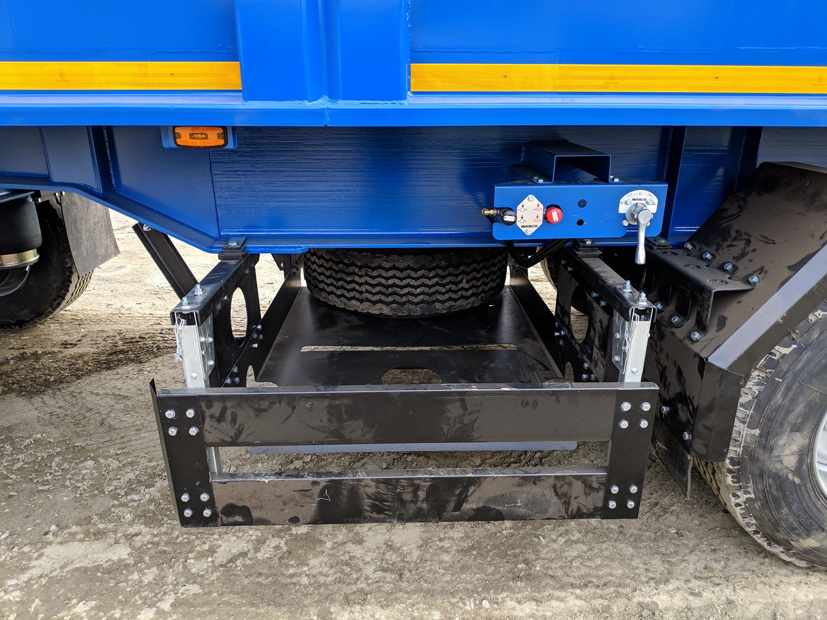 | Заднее защитное устройство Выполнено в виде цельного квадратного профиля с сечением 100*100*5 мм. и имеет заданную высоту в соответствии с требованиями п. 3.7 ТР ТС 018/2011. На ЗЗУ установлена гребенка против соскальзывания ноги, при подъеме на погрузочную площадку. Возможна конфигурация с регулируемой высотой положения в зависимости от дорожных условий. |